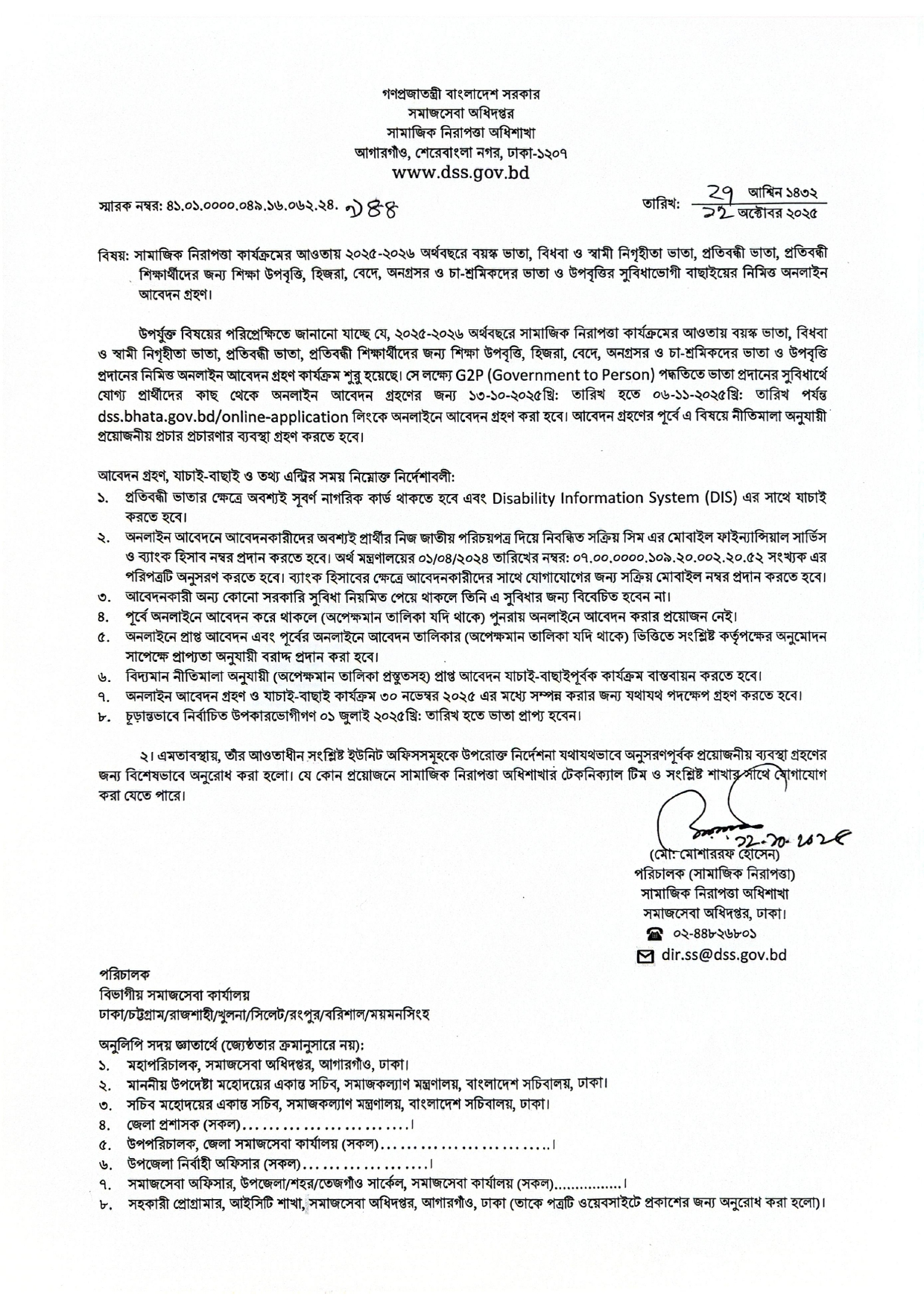 | ১ | সামাজিক নিরাপত্তা কার্যক্রমের আওতায় ২০২৫-২০২৬ অর্থবছরে বয়স্ক ভাতা, বিধবা ও স্বামী নিগৃহীতা ভাতা, প্রতিবন্ধী ভাতা, প্রতিবন্ধী শিক্ষার্থীদের জন্য শিক্ষা উপবৃত্তি, হিজরা, বেদে, অনগ্রসর ও চা-শ্রমিকদের ভাতা ও উপবৃত্তির সুবিধাভোগী বাছাইয়ের নিমিত্ত অনলাইন আবেদন | | ১৩-১০-২০২৫ | দেখুন |